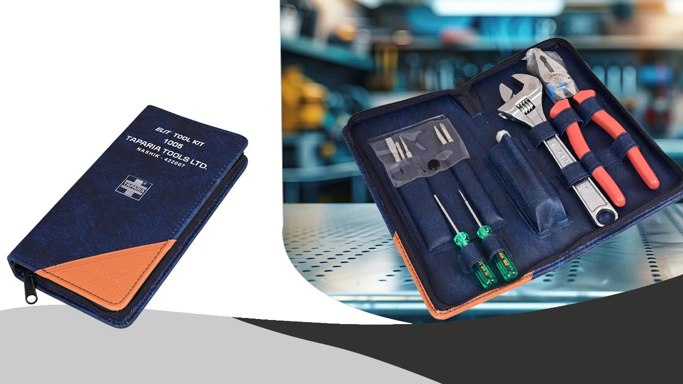 A set of tangible tools—such as screwdrivers, hammers, pliers, wrenches, tapes—organized in a box or case for tasks like home repairs, automotive maintenance, or professional work